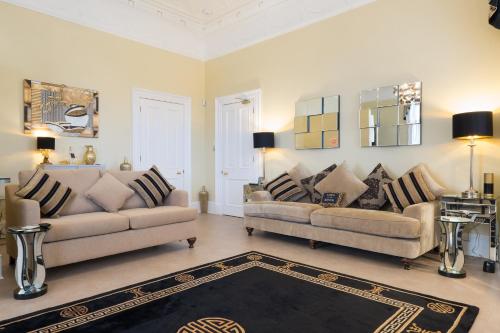 Welcome to the Sheer Luxe Apartment at Marks @ The Manor! Spacious Apartments: Our very large private apartments are exquisitely designed and fully furnished. Whether you’re a solo traveller, a couple, a family, or a business professional, we have the perfect space for you. Indulge in opulence at our exquisite “Sheer Luxe” apartment, nestled within a former manor house adorned with timeless period features. This spacious beautiful apartment is entirely furnished with homeware and furniture from Marks & Spencer the UK's leading quality retailer. Here’s why this space is your ultimate retreat: Elegant Living Spaces Stunning Views: Four beautiful 7-foot windows frame vistas of the tranquil River Dee. This was once the manor’s grand drawing room, now transformed into your private oasis. Classic Styling: The very large living room exudes sophistication with its gold and black décor. Sink into our M&S sofas, one of which doubles as a sofa bed (available upon request for a supplement) Dining Delight: Gather around the dining table for four, where memorable meals unfold against the riverside backdrop. Luxurious Amenities King-Size Comfort: Retreat to the separate bedroom, featuring a King-size M&S Luxury Bed enveloped in sumptuous M&S linens. Pampering Bathroom: Choose between a relaxing bath or an invigorating shower. Heated flooring and complimentary toiletries complete the experience. Gourmet Kitchen: Siemens appliances, an induction hob, steam oven, and inbuilt coffee maker await your culinary adventures. The plate warming drawer adds a touch of convenience. Smart Living: Adjust mood lighting and temperature effortlessly. Stream your favourite shows on the 55” LED TV with Sky TV and access to streaming services on your Bose sound system. Convenience and Tranquillity Private Entrance: Your exclusive entrance ensures privacy. River Views: Let the gentle flow of the River Dee soothe your senses. Private Parking: Park right at your doorstep. Flexible Accommodation Luxury Sofa Bed: Need extra space? Request our luxury double sofa bed for a supplement. Book your stay at the Sheer Luxe Apartment and experience Aberdeen’s finest.